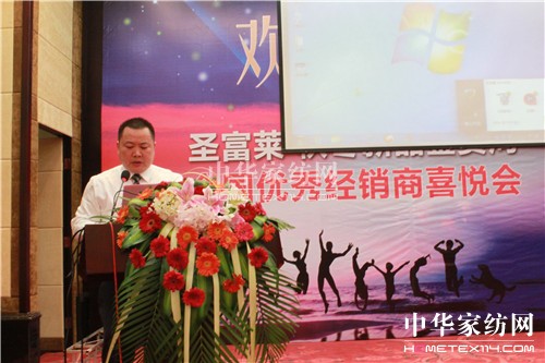 据了解,此次新品发布不仅有来自各地的老客户,更有不少新客户前来参会。在会议召开伊始,圣富莱家纺总经理刘雁飞做了精彩讲话,他在发言中表示:圣富莱家纺作为一个企业,奉行“爱人、爱公司、爱社会”的信念,在品牌建立的十一年里,凭借产品的多样化、价格的优势,受到众多消费者的关注与信任。